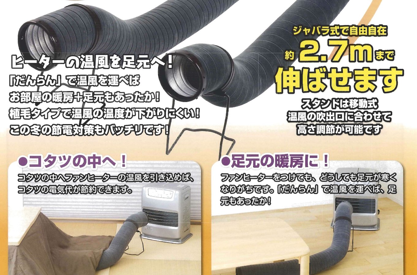 ファンヒーターから出た温風をこたつ等の中に呼び込んで温めるダクトです。