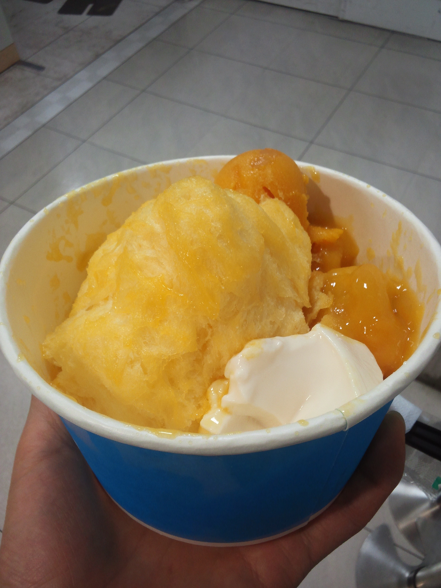 予想以上のボリュームでしたが(購入したのはテイクアウトだったので少し量が控えめのようですが)、ふわふわのわたあめのような感じで、スプーンですくった時の感触や口に入れた時の食感が独特でしたわーい(嬉しい顔)