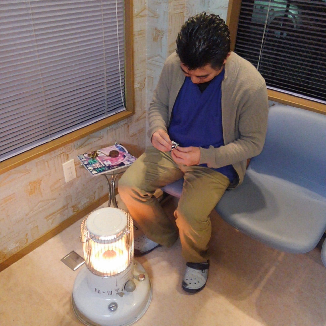 仕事後、寮長がストーブに当たりながら『知恵の輪』に取り組んでいました。