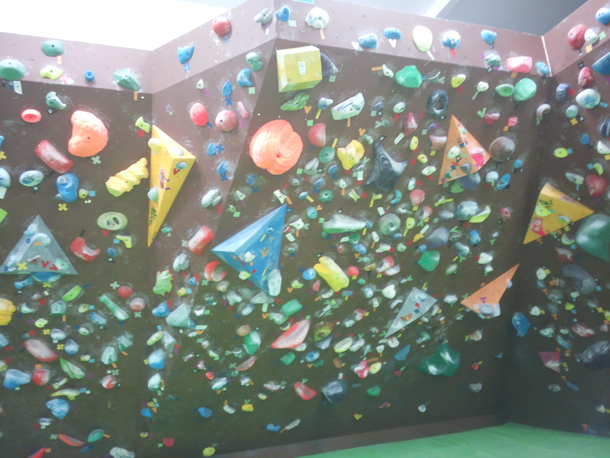 写真だとちょっと分かりにくいかもしれませんが、私が行っている所は角度が90度弱の壁から130度強の壁まで様々な角度の壁があり、その壁にくっついている突起物を掴んで登って行き、スタート地点からゴール地点を目指します。