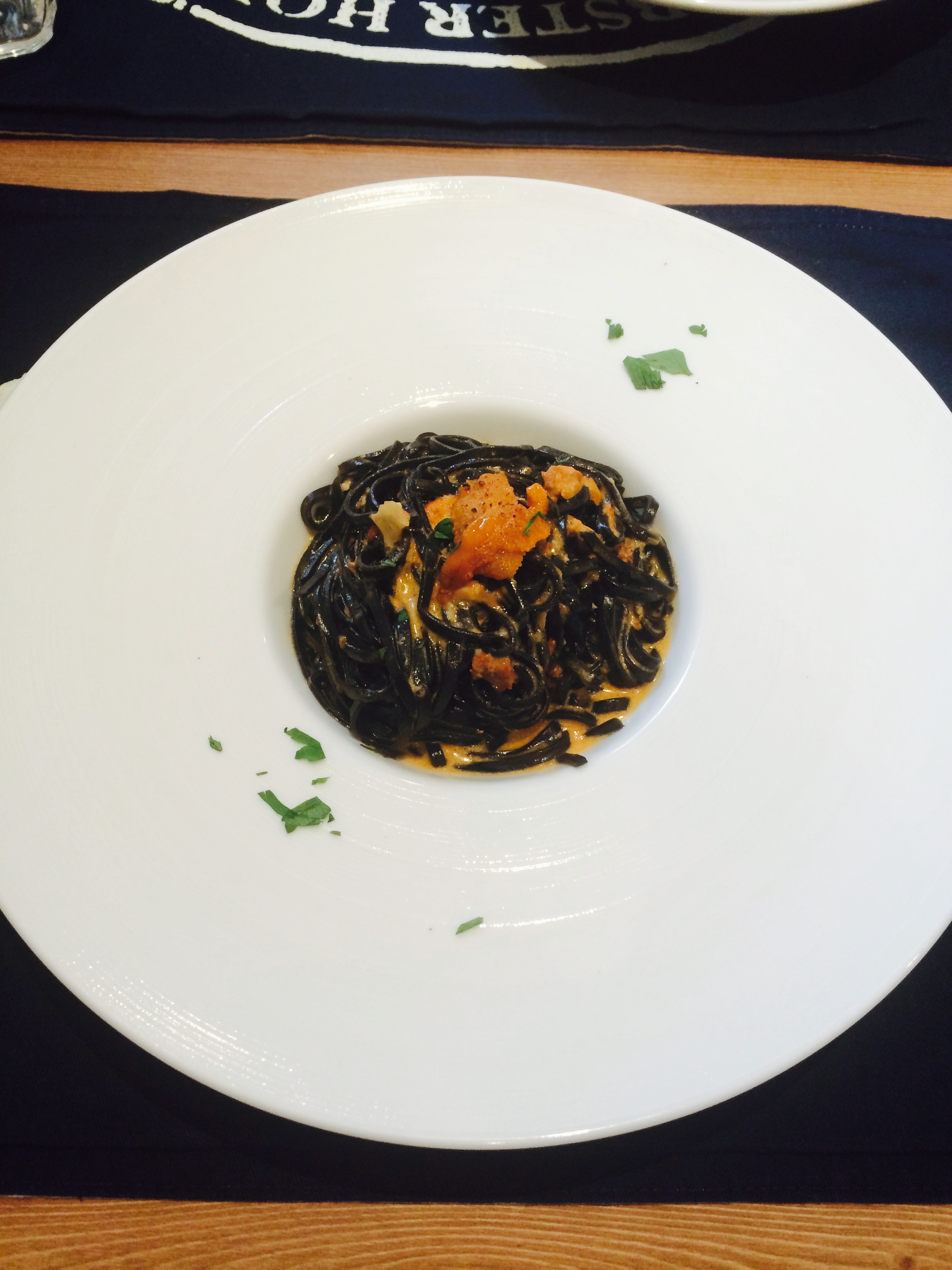 このウニのクリームソースのパスタは僕のお気に入りです!絶品です!パスタが黒いのはイカスミが練り込んであるそうです!見た目とは裏腹に、すごく優しい味がします!