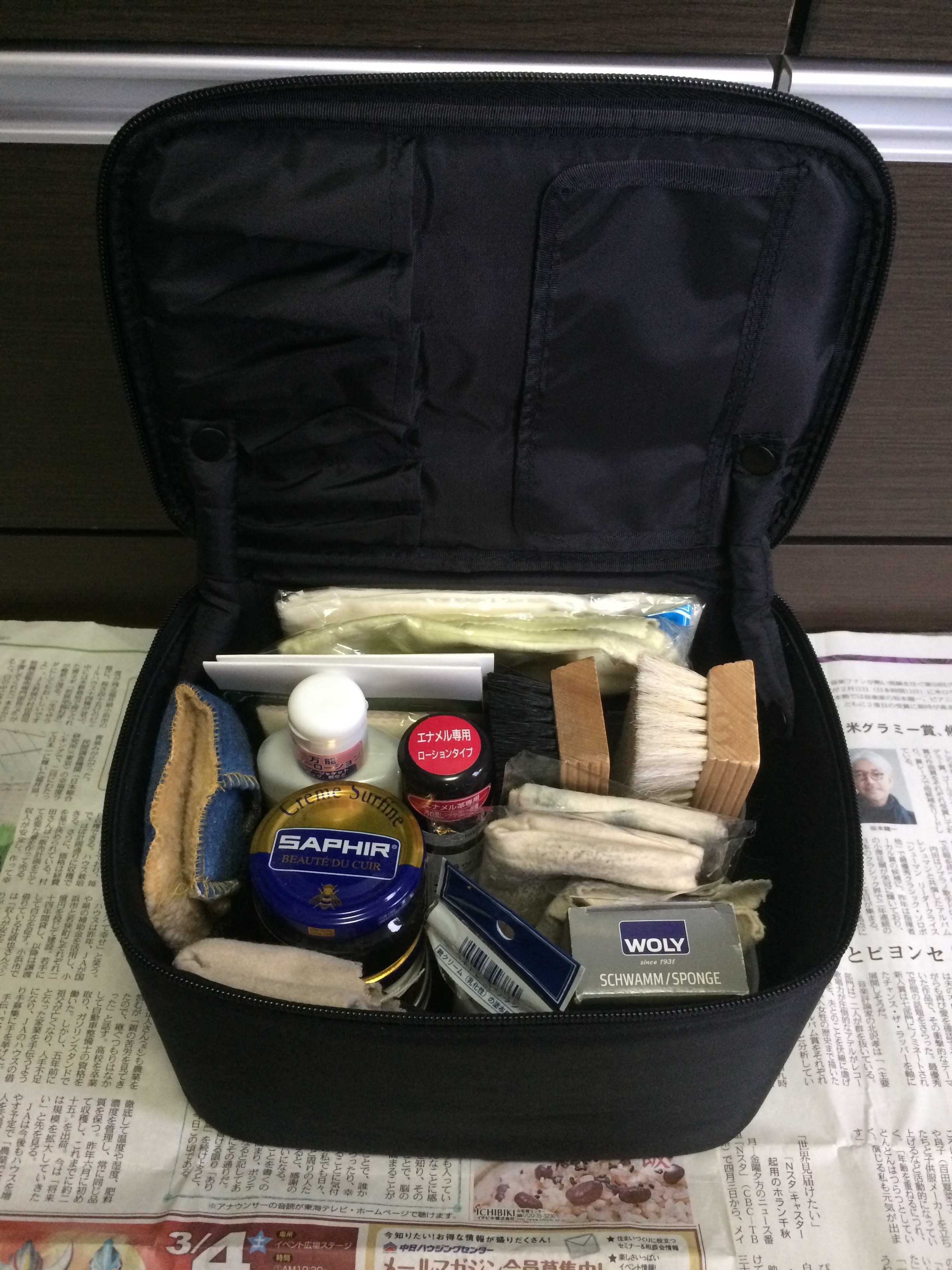使う道具ですが、クリーナー、クリーム、ブラシ、クロス(布)がメインです。革の種類で手入れが違うため、道具が多くなってしまったので僕はボックスにまとめて入れてあります。無印良品のメイクボックスで、これがなかなか仕切りも出来ていいんですよ。