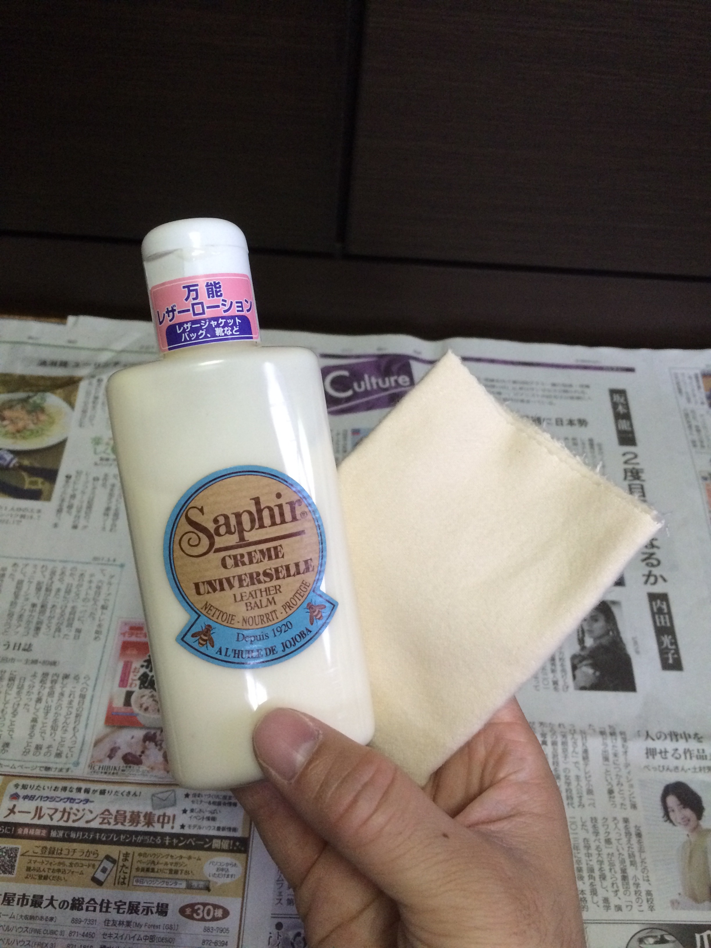 ②次にリムーバーという靴や革製品専用のクリーナーで、前回つけたクリームを落とします。人間でいうと化粧落としのようなものですね。前回つけて古くなったクリームの上から重ね塗りするのは革を痛めます。これは革に栄養を与えながら綺麗に出来るタイプです。クロスに付けてこれも優しく拭き取り、強く擦ってはダメです。全体をやり乾くのを待ってから綺麗なクロスで磨きます。これだけでも艶がでますね。