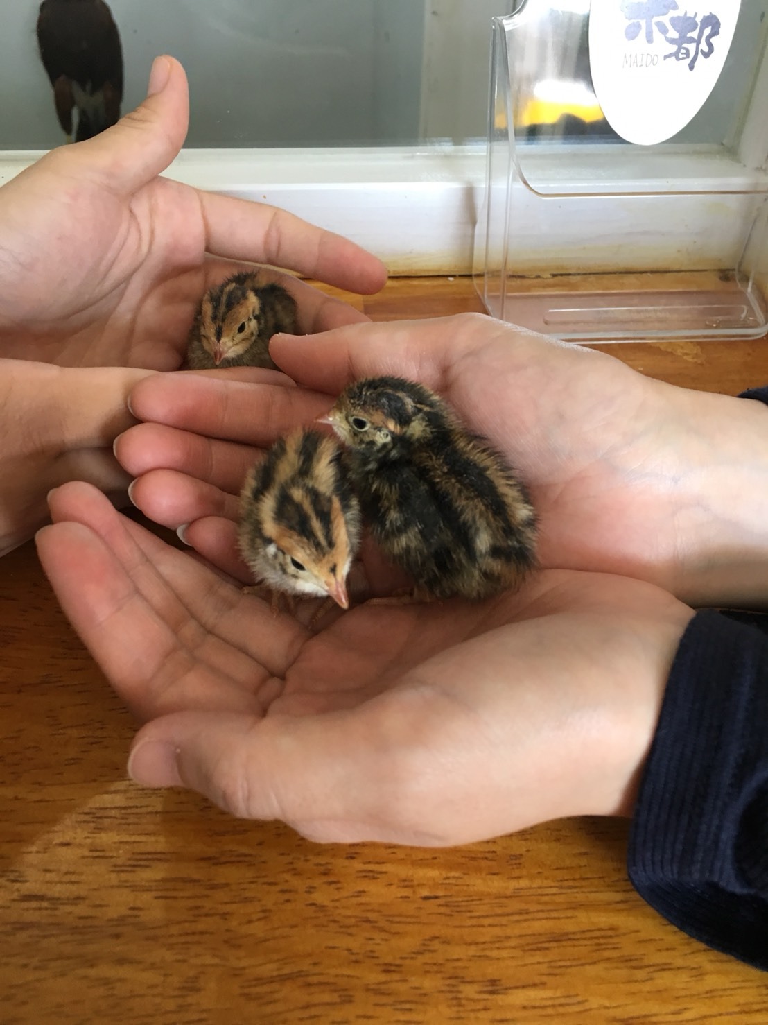 来店早々、生まれたてのうずらのヒナを手の上に…かわいい![]()