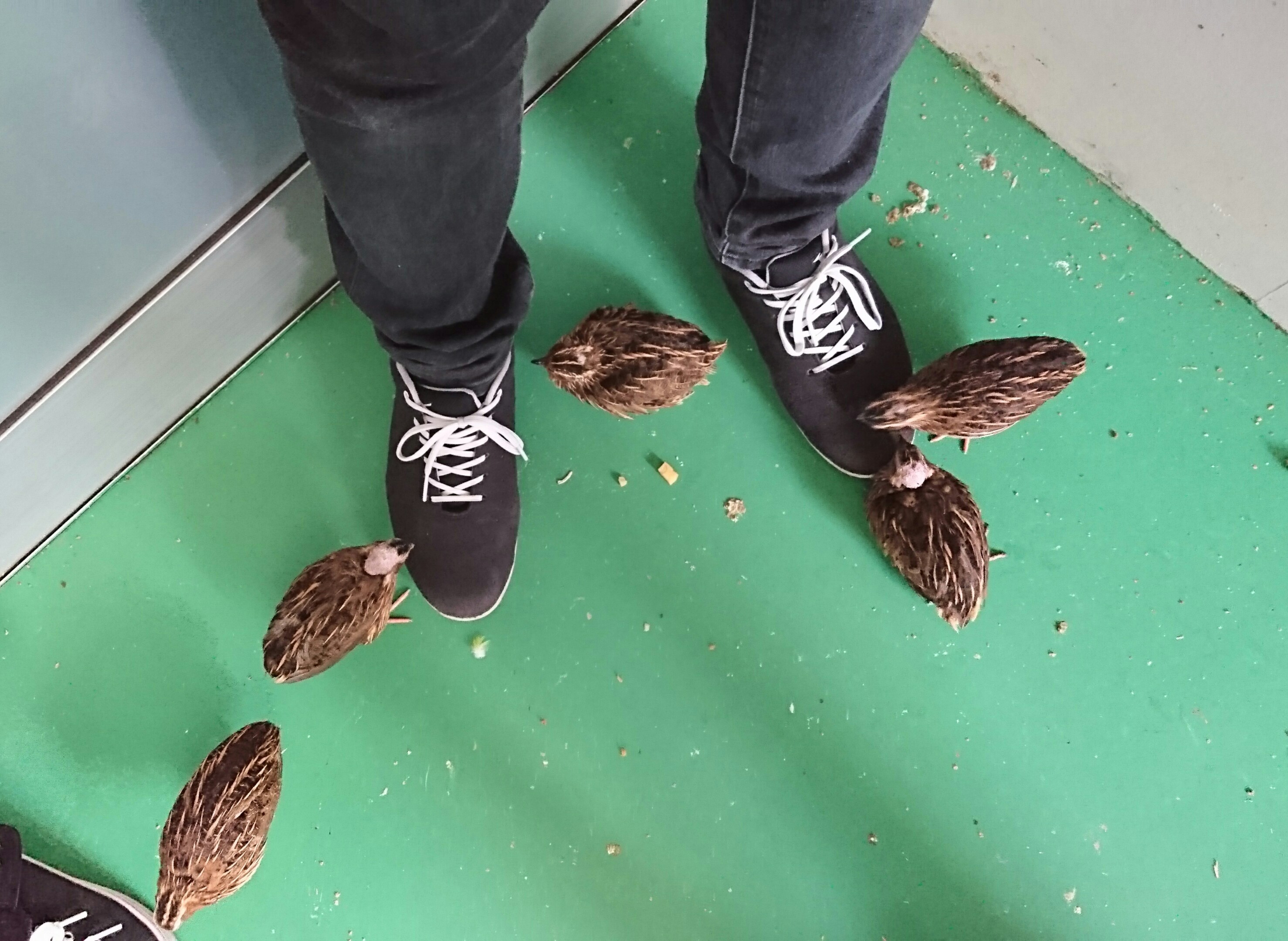 ふと足元を見るとウズラも…なぜか私の靴は大人気でつつかれました。(痛くはないです)