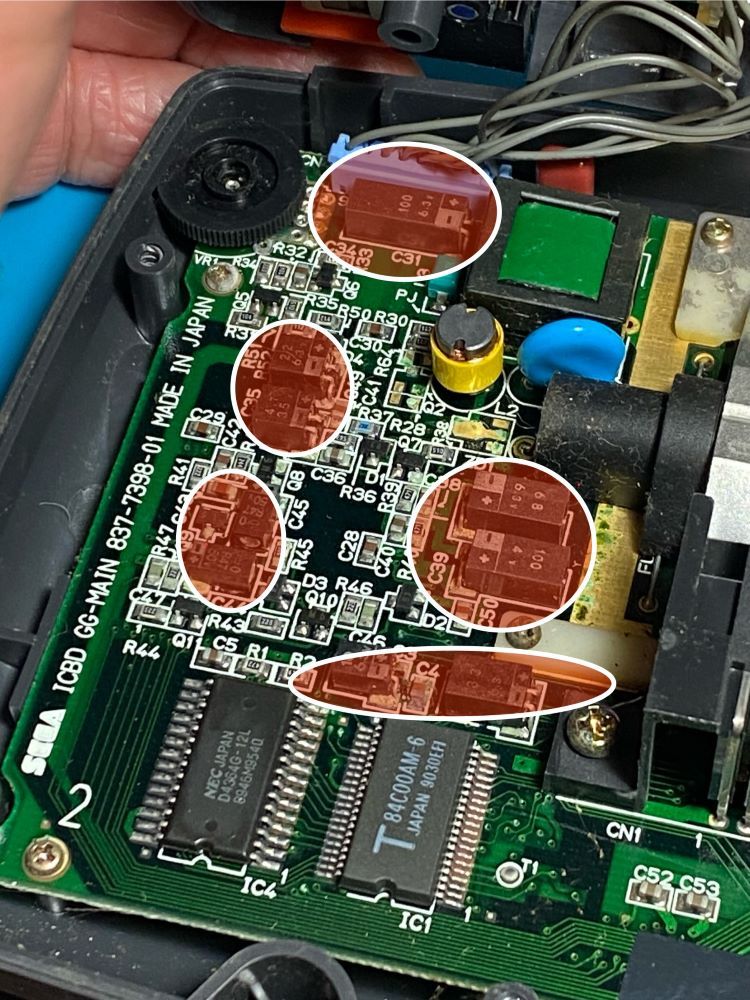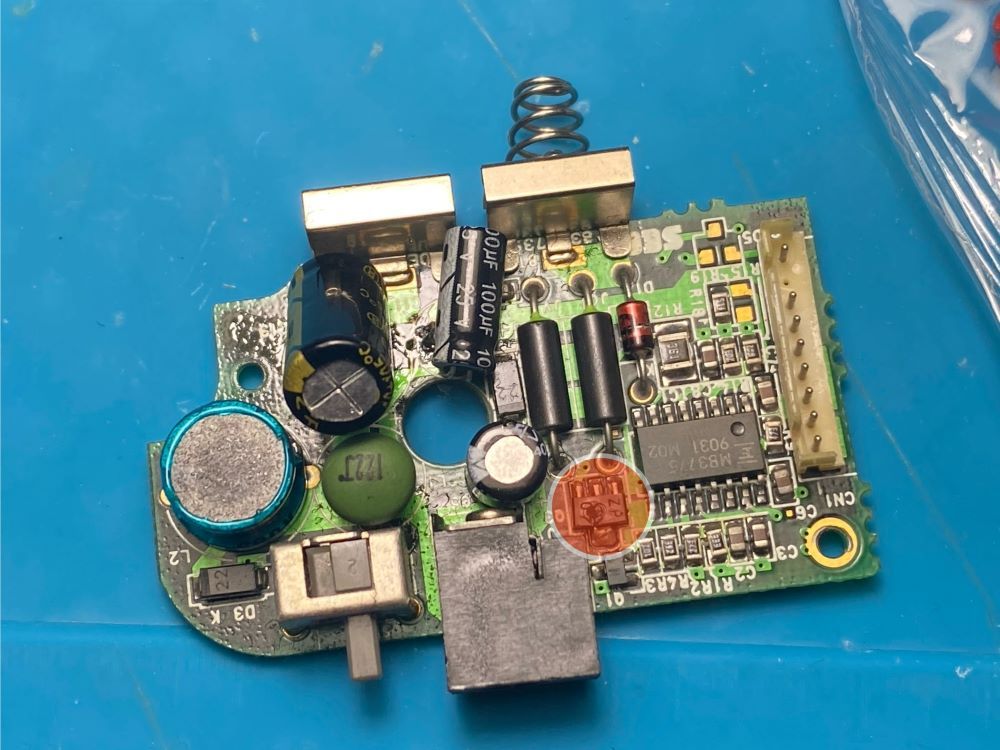 分解して、赤丸にあるコンデンサーと呼ばれる部品を総とっかえします。